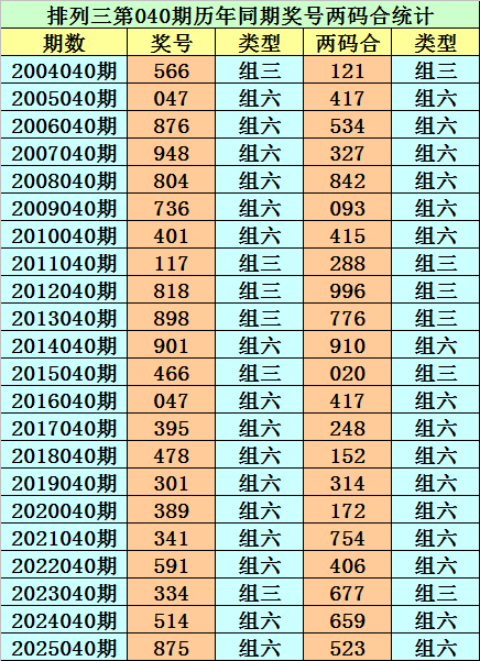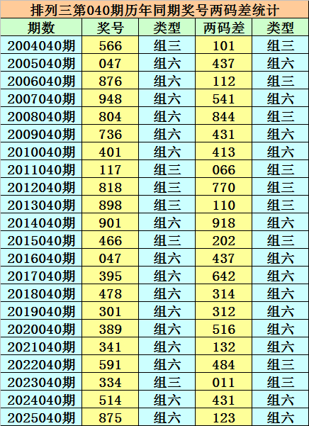 枚举三从2004年开奖于今已开出7514期奖号了,其中第040期历史同时奖号出现22次,积年第040期分袂开出号码:566、047、876、948、804、736、401、117、818、898、901、466、047、395、478、301、389、341、591、334、514、875。